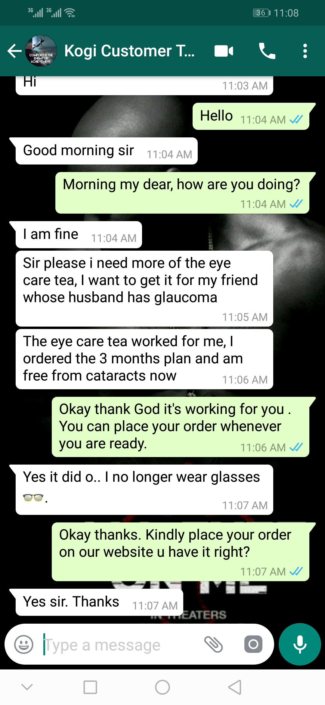 I quickly became curious and made more inquiries which led me to contact Dr. Justin. He was then the only sole distributor of this wonderful eye care Tea. I told him life’s story, how Cataract wants to steal the story of my youth from me (even after spending thousands of naira on orthodox drugs).
